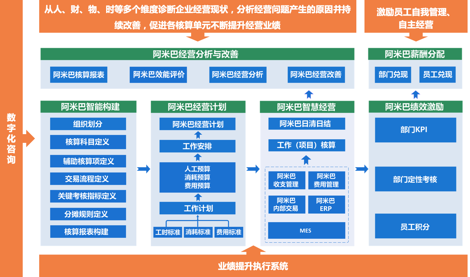 在阿米巴智慧经营软件中,预算目标是导向,从企业、事业部、部室车间、班组个人形成以工作标准为基础的全覆盖的精细化预算目标体系,有助于增强成本管控的力度,保证预算指标的有效落实;以预算指标为标准,可以为阿米巴经营核算及内部交易制定标准定价;以预算实际发生数与预算指标的对比分析,可以由软件自动发现经营问题,并借助人工智能和大数据分析技术,从人、财、物、时等多个维度分析问题产生的原因,制定合理有效的经营改善方案,实现经营持续改进。