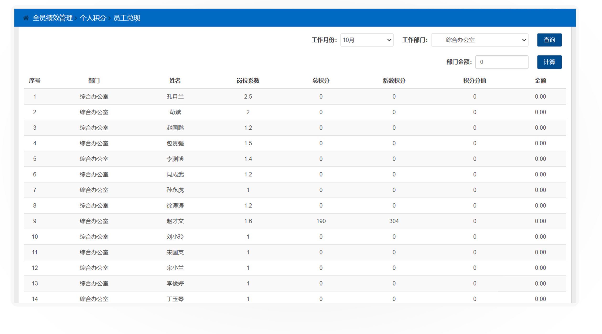员工兑现金额=部门兑现总额*个人得分/部门总积分*员工岗位系数*员工分配系数