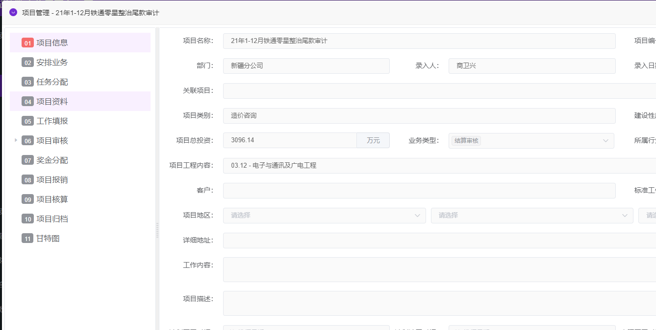 项目管理过程的管控,从项目前期(项目信息、安排业务),项目中期(任务分配、项目资料、工作填报、项目工作内容审核),项目后期(奖金分配、项目报销、项目核算、项目归档)